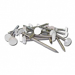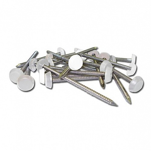 The White 65mm Polytop Pins are stainless steel nails with a white head, designed for securing 17mm fascia and uPVC/plastic boards, offering durability, corrosion resistance, and a clean finish.