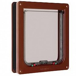 The Catmate 221 4-Way Locking Large Cat Flap - Brown is a secure, versatile solution for larger cats and small dogs. It features a self-lining frame and a 4-way locking system, perfect for controlling your pet's access through doors, walls, and thin panels.