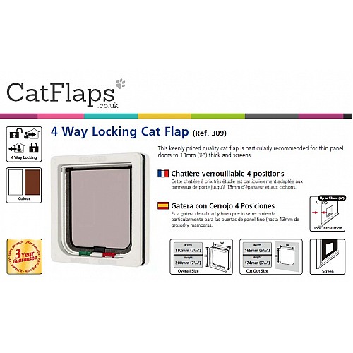 The Catmate 309 4-Way Locking Cat Flap combines functionality, durability, and style, making it a must-have for thin panel doors. With its adjustable locking system and easy installation, it's the perfect accessory for modern cat owners.