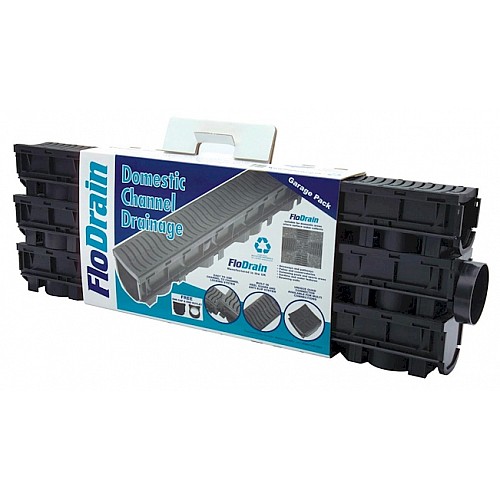 The FloPlast FloDrain Domestic Channel Drainage Garage Pack (125mm x 1040mm) offers a complete drainage solution for domestic areas, featuring anti-slip grating, easy installation, and flexible outlet options. Ideal for driveways, patios, gardens, and more, this 3m kit ensures efficient water flow and durability.