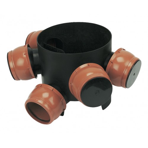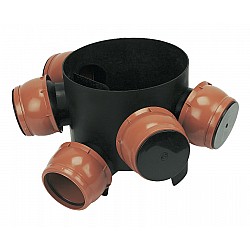 The Floplast Mini Access Chamber D800 is a 300mm diameter polypropylene chamber designed for use in underground drainage systems. It features 5 flexible 110mm inlets, each allowing up to 20º of movement in any direction, ensuring easy alignment with connecting pipes. This chamber is compatible with both standard and screw-down covers and frames, capable of withstanding up to 35kN (3.5 tonne) loading. The chamber is ideal for gravity drainage and sewerage systems, offering easy access for maintenance and inspection.