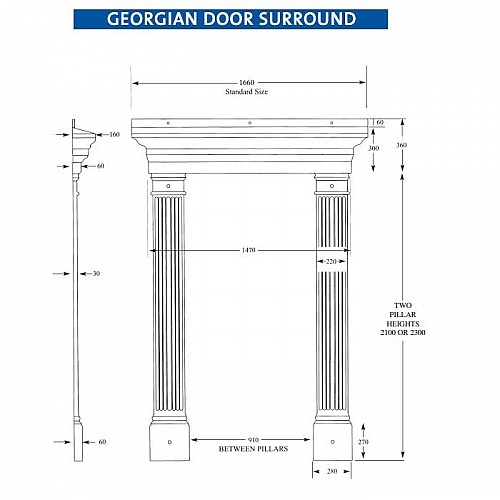 Available in standard sizes with pillar heights of 2100mm or 2300mm, the Georgian Door Surround can also be custom-made to fit your specific measurements, ensuring a tailored fit for your space. This surround is made from strong, rigid fibreglass, ensuring longevity and a maintenance-free finish that will continue to impress for years to come.