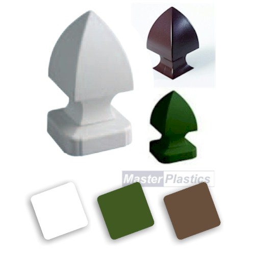 Enhance the look of your fence with the Gothic Decorative Post Cap. Designed to fit both in-line and corner posts, this decorative cap adds a stylish, classic touch to your fencing setup. It easily fixes onto a flat cap supplied, offering an elegant finishing touch to your posts. Available in three attractive colours—brown, green, and white—this versatile post cap can complement various fence designs and outdoor aesthetics.