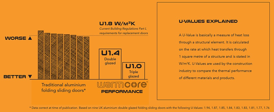 Using standard double glazing the WarmCore folding sliding door achieves a U-value of 1.5, with U-values as low as 1.0 achievable using 44mm triple glazing. The advantage against traditional aluminium doors is clear, with many struggling to meet current legislation.